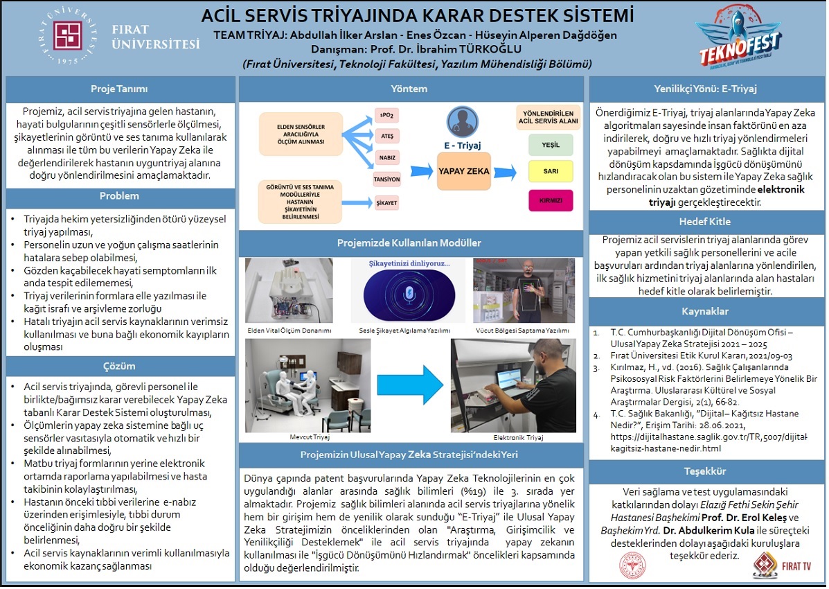 Proje danışmanlığını Prof. Dr. İbrahim TÜRKOĞLU'nun yürüttüğü, Fırat Üniversitesi Teknoloji Fakültesi, Yazılım Mühendisliği bölümü öğrencilerinden Abdullah İlker Arslan, Enes Özcan ve Hüseyin Alperen Dağdögen tarafından hazırlanan “Acil Servis Triyajı Karar Destek Sistemi” projesi İstanbul’da 21-26 Eylül 2021 tarihlerinde yapılan TEKNOFEST’te “İnsanlık Yararına Teknoloji” yarışmalarında “Sağlık ve İlk Yardım” kategorisinde En İyi Sunum ödülüne layık görüldü.