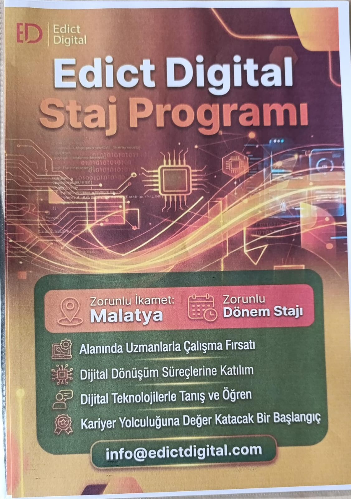 Bahar döneminde İş Yeri Eğitimini Malatya'da yapmak isteyen öğrencilerimiz başvurularını CV içerir bir mail ile yapabilirler.